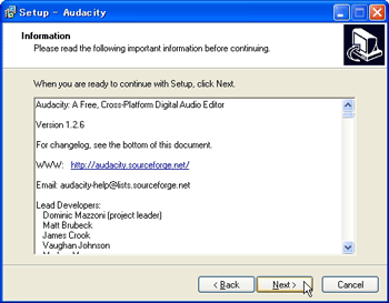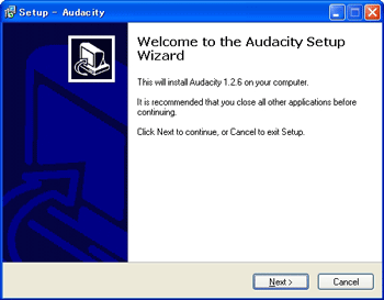 ![]() | 【1】 ダウンロードした「audacity-win-1.2.6.exe」をダブルクリックすると、左図の画面が開きます。 |