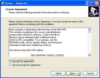 ![]() | 【3】 ラジオボタンの「I accept the agreement」を選び、[ Next >] ボタンをクリックします。 |