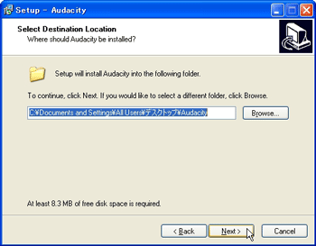 ![]() | 【5】 保存先を指定し、[ Next >] ボタンをクリックします。 大学のコンピュータ教室で、シャットダウンすると設定が初期化される場合は、自分が割り当てられている箇所(マイ ドキュメント フォルダ内など)を保存先として指定してください。 保存先の変更は、[Browse] ボタンをクリックして行います。 |