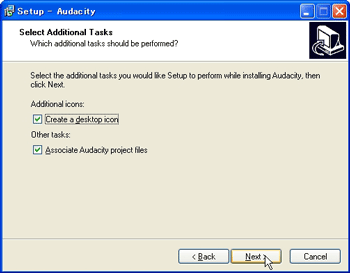 ![]() | 【6】 Associate Audacity project files にチェックしてあるのを確認し、[ Next >] ボタンをクリックします。 |